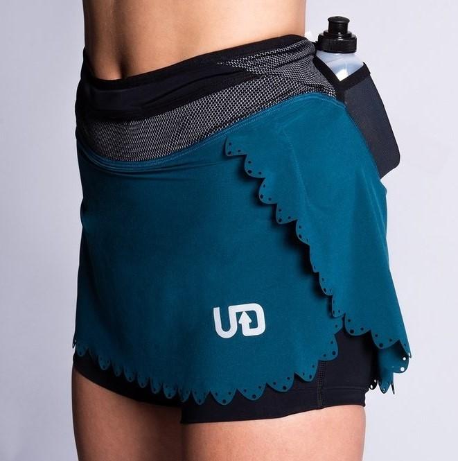 La falda Hydro tiene dos bolsillos personalizados para botellas integradas para llevar 600 ml de hidratación. No te rozará, subirá ni rebotará, y hay un gran bolsillo central trasero para llevar tu teléfono (incluso los teléfonos de tamaño grande).